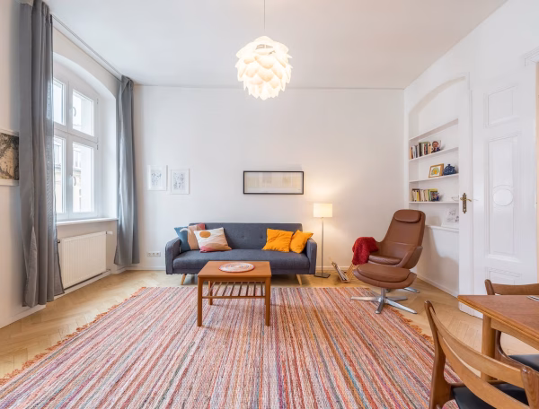 Die möblierte Wohnung strahlt eine wohnliche Wärme aus und man fühlt sich beim Betreten des Apartments sofort wohl. Sie betreten die Wohnung über den langen Flur, von dem die Zimmer abgehen. Im Wohnzimmer befinden sich ein Sofa und ein Sessel sowie ein großer Smart-TV. Dort finden Sie auch einen Esstisch für vier Personen. Im Hauptschlafzimmer befindet sich ein gemütliches Doppelbett und ein Kleiderschrank. Das dritte Zimmer kann als zweites Schlafzimmer genutzt werden, da sich hier ein Schlafsofa befindet, Sie können es aber auch als separates Büro nutzen, da Sie hier auch einen Schreibtisch finden, an dem Sie ungestört arbeiten können. Die Küche ist mit allen notwendigen Haushaltsutensilien, einem großen Kühlschrank mit Gefrierfach, einem Backofen, einer Spülmaschine, einem Wasserkocher, Töpfen und Pfannen und Besteck ausgestattet. Die Wohnung verfügt über bodentiefe Fenster, die viel Licht in die Wohnung lassen. Die für Berlin typischen Flügeltüren verleihen der Wohnung ihren besonderen Charme. Der Balkon kann von der Küche aus betreten werden und blickt auf den ruhigen Hinterhof, sodass Sie keine Geräusche hören, während Sie die wärmeren Morgen genießen.