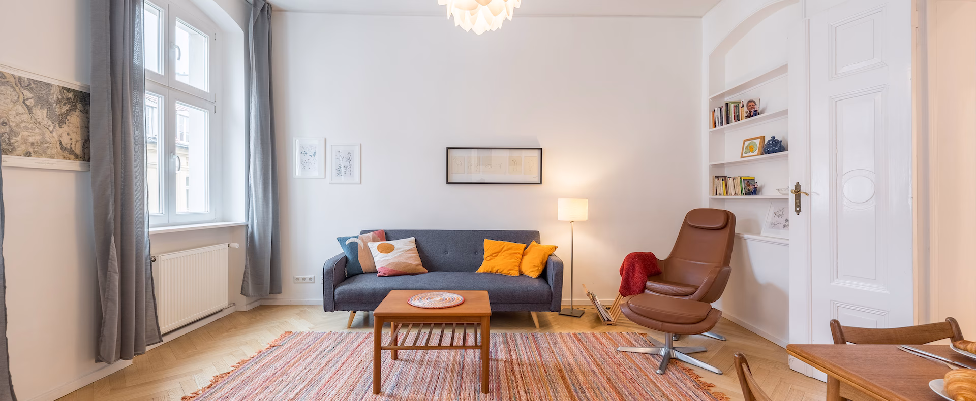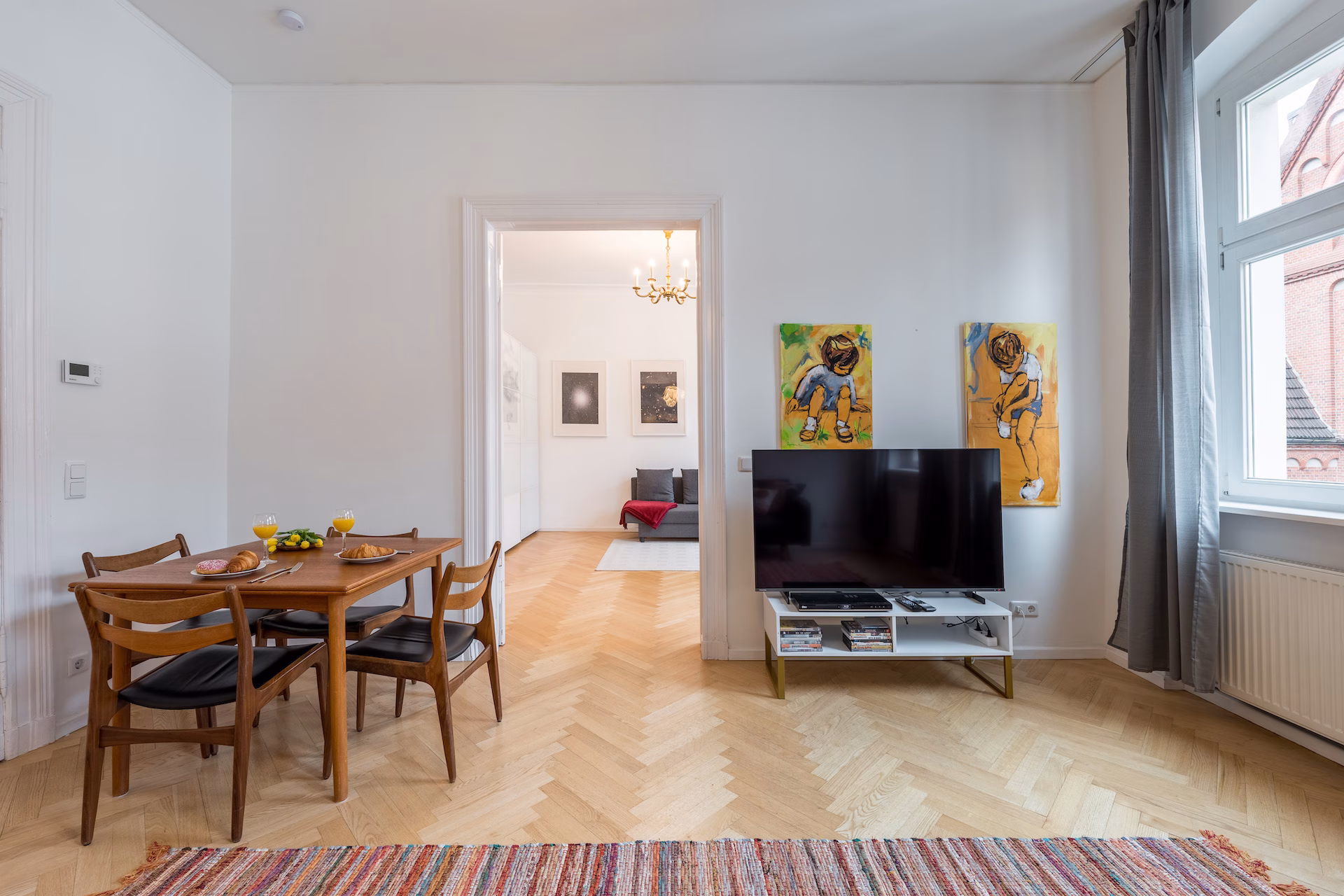 The furnished apartment radiates a homely warmth and you immediately feel comfortable when entering the apartment. You enter the apartment in the long hallway from which the rooms lead off. There is a sofa and an armchair and a large smart TV in the living room. You will also find a dining table that fits four people. There is a cozy double bed and a wardrobe in the main bedroom. The third room can be used as a second bedroom as there is a sleeping bed here, but you can also use it as separate office as you will also find a desk here where you can work undisturbed. The kitchen is equipped with all necessary household utensils, a big refrigerator with a freezer, an oven, dishwasher, a kettle, pots and pans and cutlery. The apartment has floor-to-ceiling windows that let a lot of light into the apartment. The wing doors typical of Berlin give the apartment its special charm. The balcony can be entered from the kitchen and faces the quiet backyard, so you won’t hear any noises while enjoying warmer mornings.
