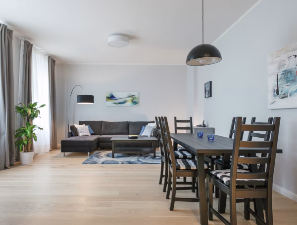 Step into this stylish 1-bedroom apartment, where comfort and functionality meet in a beautifully designed space. The apartment features a lovely wooden floor throughout, creating a warm and inviting atmosphere. Tastefully furnished with high-end pieces, it’s the perfect spot to unwind after a busy day. Relax on the comfortable sofa while enjoying your favorite shows on the Smart TV, or gather with friends and family around the spacious dining table that comfortably seats up to 6 people.