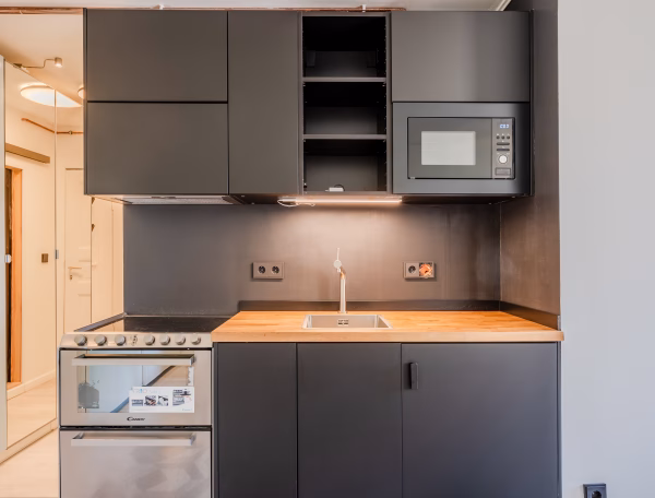 This stylish one bedroom apartment has been fully renovated and newly furnished in the Spring of 2024. The kitchen is equipped with all necessary household utensils, a stove, a refrigerator + freezer, a dishwasher, a coffee machine, cooking utensils, pots and pans, plates, bowls, glasses, mugs and cutlery. There is a cozy sofa and a dining table that fits up to three people. The bedroom is equipped with a comfortable double bed (160 x 200 cm). You will also find a very large wardrobe where you can store all your items. In the bathroom, you will find a shower and the washing machine is also located here.