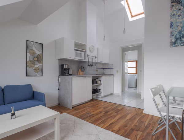 Experience modern living in this furnished two room apartment located in central Berlin. The open concept apartment feels homy and is equipped with all necessary utensils. You will find a comfortable sofa and a smart tv in the living room. Here you can also enjoy a meal on the dining table that fits up to four people. There is a cozy double bed and a chest of drawers in the bedroom. The bathroom is equipped with a large bathtub and a washing machine.