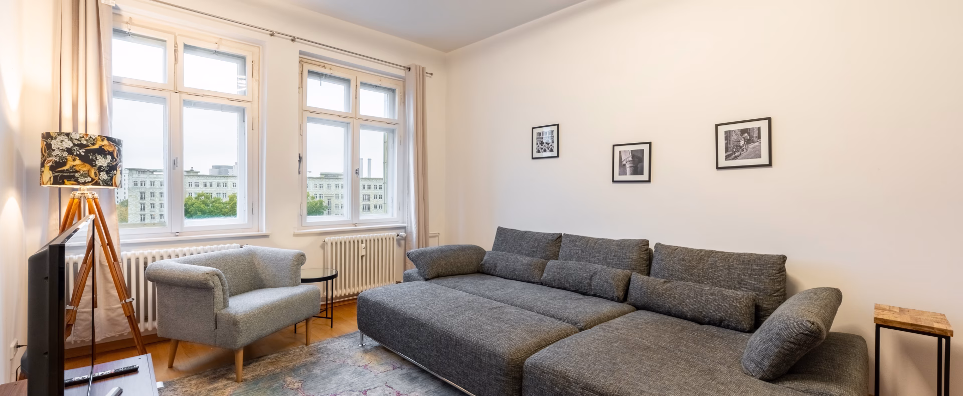 The apartment offers all needed appliances. There is a bedroom, a separate living room and a kitchen, all fully furnished in modern taste.